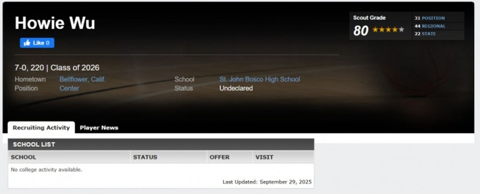 直播吧10月1日讯 ESPN更新了全美高中生排名,其中中国旅美球员2027届的刘朕赫评分82分,获得四星评级。26届的吴天昊评分80分,也获得四星评级。