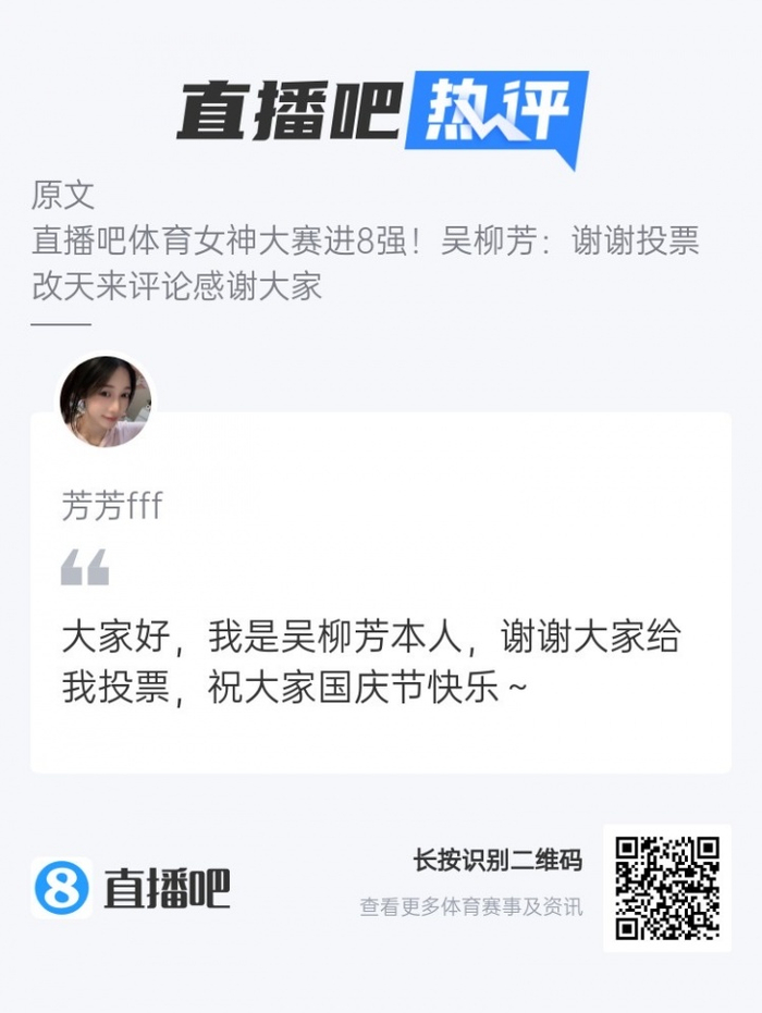 早在周二晚,吴柳芳在个人抖音直播中被粉丝提醒已进入到直播吧体育女神大赛八强,她当时就回应表示:“谢谢你们的投票,我知道我知道。改天我也去下一个APP,然后去评论区感谢一下大家。”