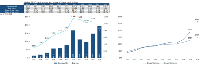 报告显示,尽管 2024 年的步伐有所放缓,但全球 VC 交易活动在人工智能领域持续激增。2025 年交易价值的一半以上和已完成交易的 30% 流向了人工智能初创公司,凸显了投资者的关注焦点。