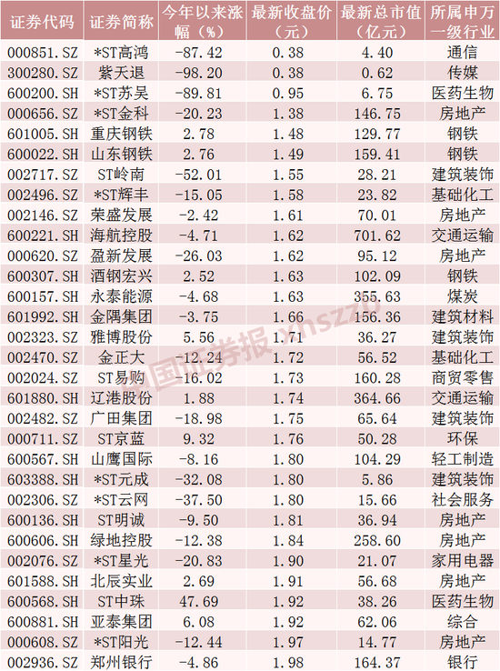 Wind数据显示,截至9月30日,收盘价(前复权)低于2元的低价股数量为31只。其中股价最低的是*ST高鸿,最新收盘价为0.38元。