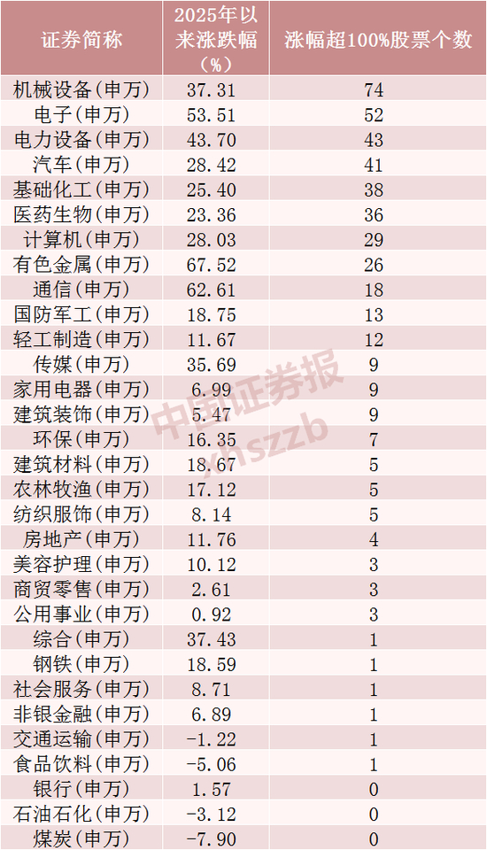 在446只涨幅超100%的股票中,来自机械设备、电子行业的股票最多,分别为74只、52只,来自电力设备、汽车、基础化工、医药生物行业的股票均超30只,来自计算机、有色金属行业的股票均超20只。这些牛股频出的行业板块,也是今年以来活跃的机器人、半导体、固态电池、DeepSeek等热门概念股集中的板块。