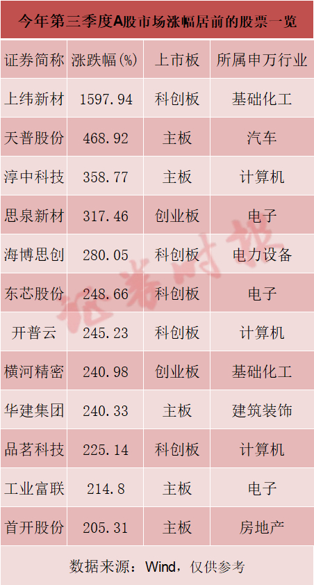 具体来看,今年第三季度逾千只股票涨幅超过30%,逾90只股票涨幅超过100%。其中,上纬新材、天普股份、淳中科技、思泉新材、海博思创、东芯股份、开普云、横河精密、华建集团、品茗科技、工业富联、首开股份等股票期间累计涨幅超过200%。