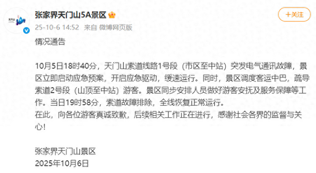 10月5日18时40分,天门山索道线路1号段(市区至中站)突发电气通讯故障,景区立即启动应急预案,开启应急驱动,缓速运行。同时,景区调度客运中巴,疏导索道2号段(山顶至中站)游客。景区同步安排人员做好游客安抚及服务保障等工作。当日19时58分,索道故障排除,全线恢复正常运行。
