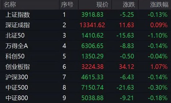 12月9日早盘,A股小幅震荡,主要股指涨跌互现,深证成指、创业板指飘红,上证指数、北证50、沪深300等微幅飘绿。下跌个股远多于上涨个股,成交保持平稳。