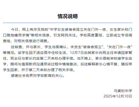·浙江嵊州一学校回应“女生被宿舍孤立关在门外一夜”:未发生相关情况。