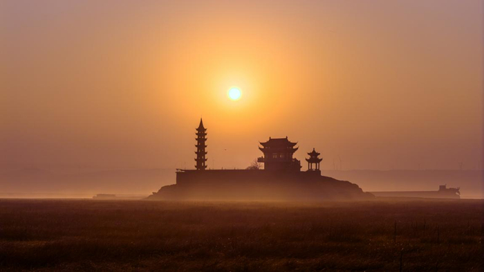 在江西九江,晨雾笼罩鄱阳湖面,落星墩孤亭静立,与远山共织水墨长卷。