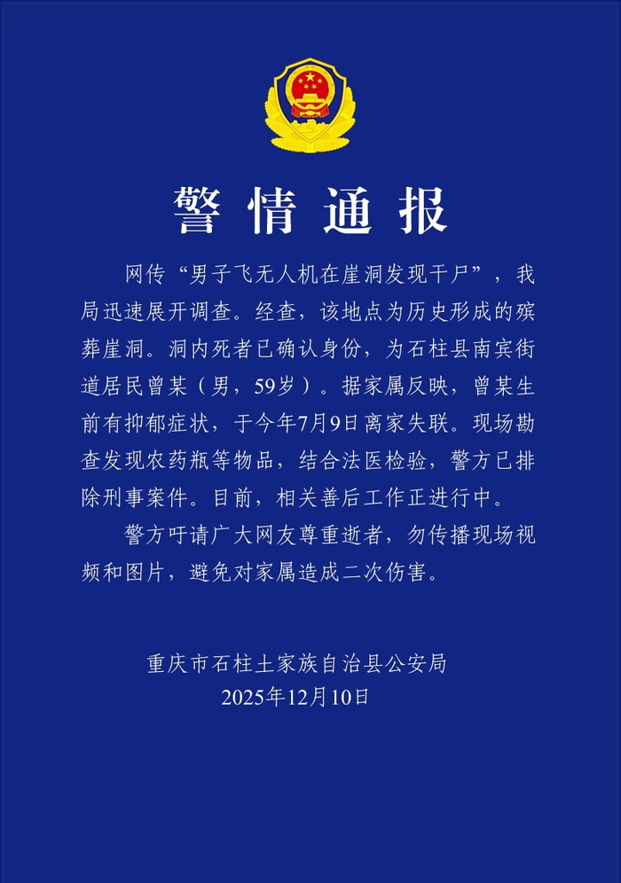 ·男子飞无人机在崖洞发现干尸?警方通报。