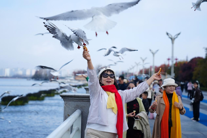 12月9日,云南昆明,游客在滇池海埂大坝给红嘴鸥喂食、拍照。