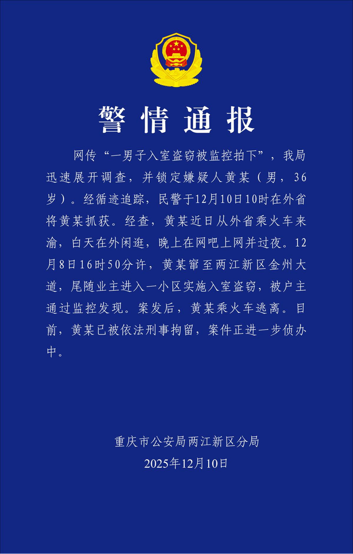 ·重庆警方通报“男子入室盗窃被监控拍下”:已在外省将其抓获。