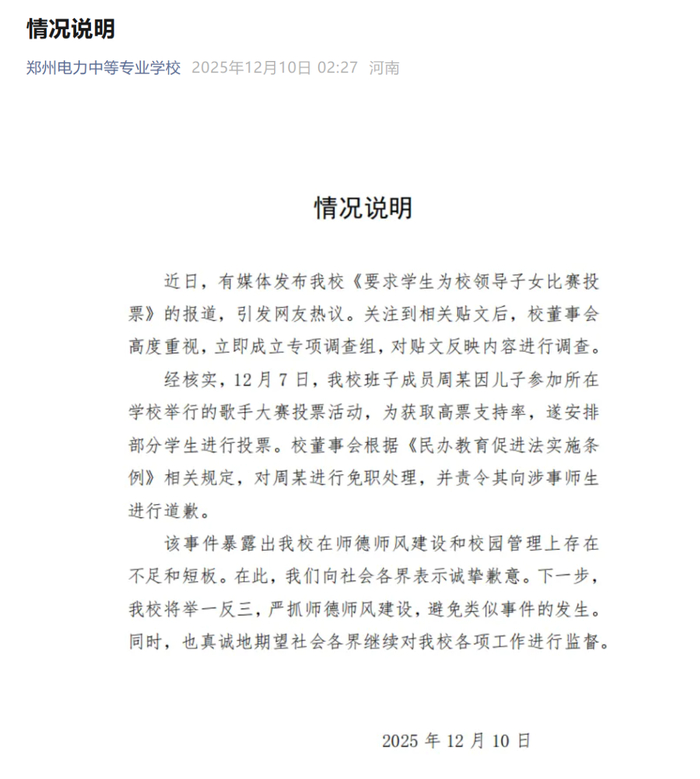 ·校领导要求学生为其儿子比赛投票,河南涉事学校通报:周某已免职!