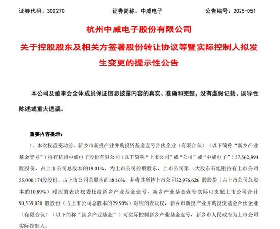 权益变动完成后,中威电子控股股东仍为新乡产业基金壹号,中威电子实际控制人由新乡市人民政府变更为付英波。公司股票将于2025年12月12日复牌。
