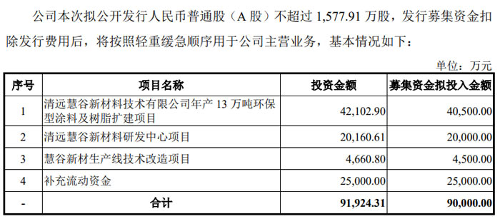 具体来看,清远慧谷新材料技术有限公司年产 13 万吨环保型涂料及树脂扩建项目拟投入 4.05 亿元,项目建成后将大幅提升公司产能规模;清远慧谷新材料研发中心项目拟投入 2 亿元,用于加强基础研究及工艺开发能力;慧谷新材生产线技术改造项目拟投入 4500 万元,将改善广州生产基地智能化制造水平;补充流动资金 2.5 亿元,将优化公司资金状况,支持主营业务持续发展。