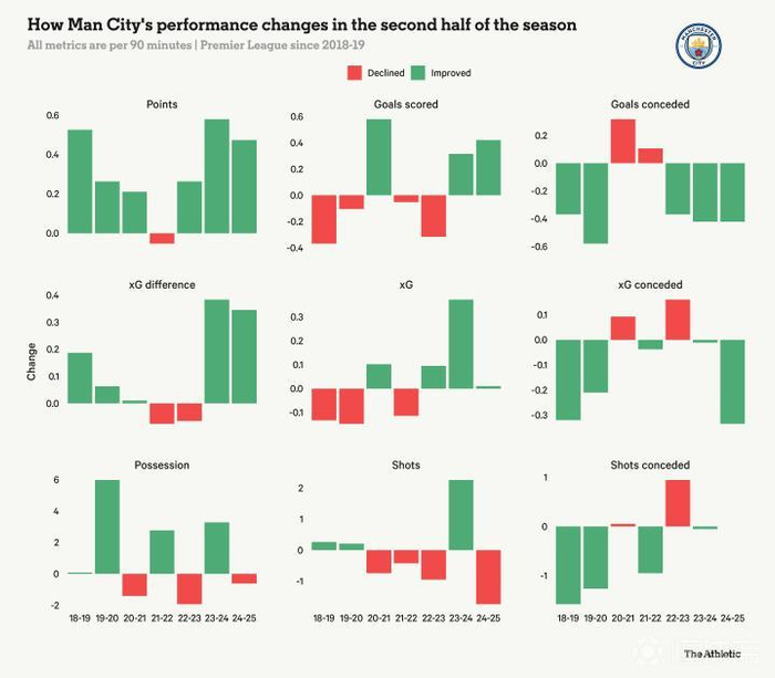 下图中的数字显示,他们的积分往往在赛季中期后飙升,并且其基础是防守端逐渐稳固。瓜迪奥拉会利用上半赛季的经验教训来填补漏洞,为另一座冠军铺平道路。