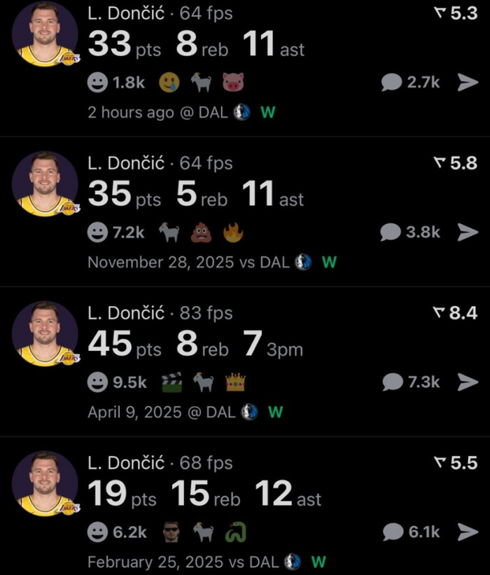 在此前对阵独行侠的三场比赛中,东契奇分别得到19分15篮板12助攻、45分8篮板7助攻、35分5篮板11助攻,他面对独行侠四场比赛场均33分9篮板10.3助攻。