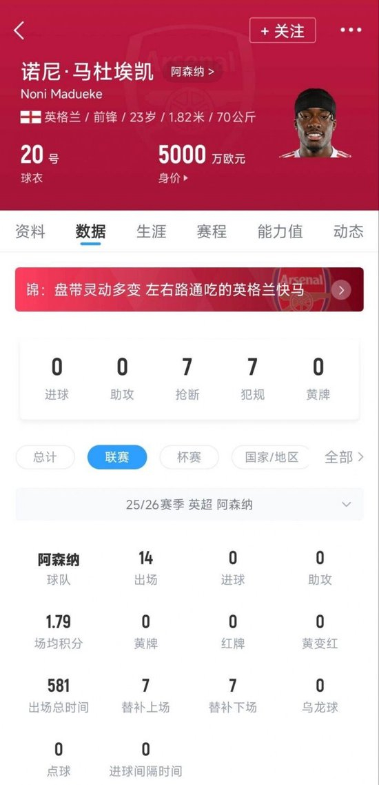在英超联赛,马杜埃凯出战14场,7首发7替补0球0助,虽然他的突破和防守贡献不容忽视,但数据上确实仍未破荒。