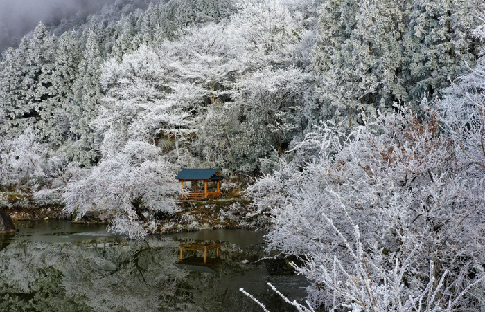 受强冷天气影响,融水苗族自治县安太乡元宝山迎降雪天气,田野、山林、屋顶,银装素裹,玉树琼花,如诗如画。(融水苗族自治县纪委监委供 龙林智/摄)