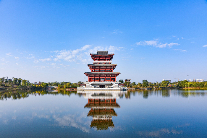 柳州湿地公园湖畔的古塔在澄澈如镜的湖面投下对称的倒影,红瓦、白台、蓝天、流云在水中完美交融,成为城市里一方诗意的秘境。(柳州市柳南区纪委监委供 莫兰盛/ 摄)