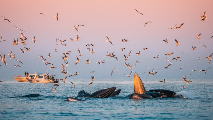 涠洲春信早,一月海生光,鲸阵分蓝浪,金鳍破碧沧,鸥随潮共舞,风裹暮同长。这场海天共舞的生态奇观是大自然赐予涠洲岛最好的新年贺礼。(北海市纪委监委供 郭庆华/摄)