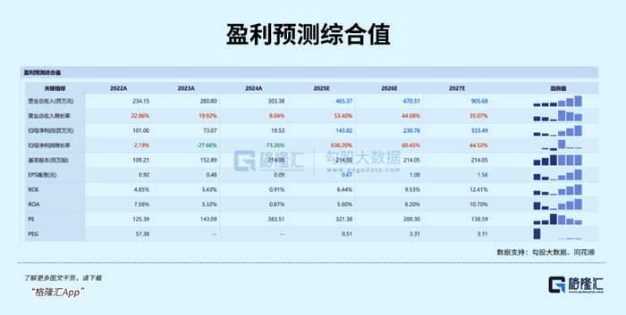 据中航证券预测,2025-2027年公司营收分别达4.51亿元、6.31亿元、8.50亿元,归母净利润1.30亿元、1.82亿元、2.54亿元,EPS0.61元、0.85元、1.18元,当前股价对应PE分别为117倍、84倍、60倍。