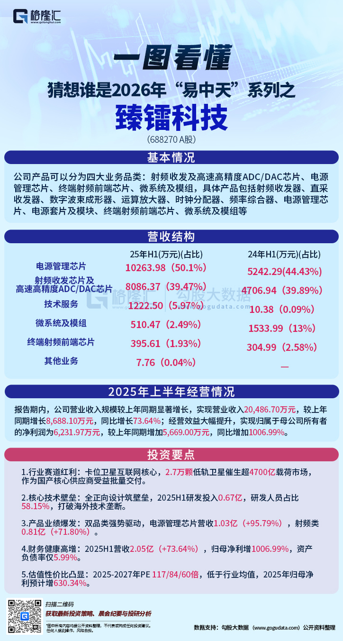 今天为大家聚焦专注射频芯片与微系统的臻镭科技(688270),其凭借技术垄断性、产业链不可替代性及业绩高弹性,成为2026年商业航天领域极具期待的潜力标的,以硬核技术定义赛道,用业绩爆发印证价值。