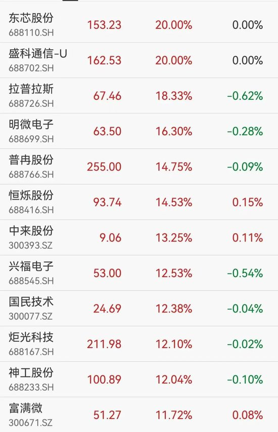 芯片股领涨市场。华天科技反包涨停,华虹公司盘中一度涨超8%,再创历史新高,截至收盘,涨超7.7%,总市值突破2000亿。东芯股份、盛科通信20cm涨停,康强电子涨停,明微电子、普冉股份、恒烁股份、国民技术、兴福电子等多股涨超12%。