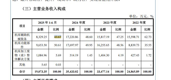 分产品看,公司主要产品之一即机床辅助机械装备,毛利率从2022年的25.82%降至2025年上半年的15.50%。公司称,主要系该产品定制化特点突出,不同型号之间毛利率水平差异较大,且报告期内相关产品市场竞争逐步加剧,公司通过商业策略调整以巩固市场份额。