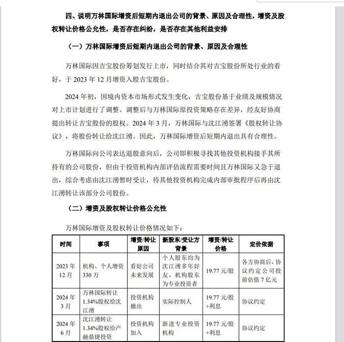 万林国际向吉宝股份表达退股意向后,公司即积极寻找其他投资机构接手其所持有的公司股份,但由于投资机构内部评估流程需要时间且万林国际又急于退出,综合考虑,2024年3月沈江湧暂时受让相关股份,股权转让价格为入股价格加持股期间利息。