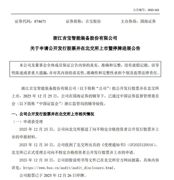 在这样的背景下,2025年12月25日,吉宝股份“踩线”向北交所报送了上市申报材料,并于12月30日获得了北交所的受理。