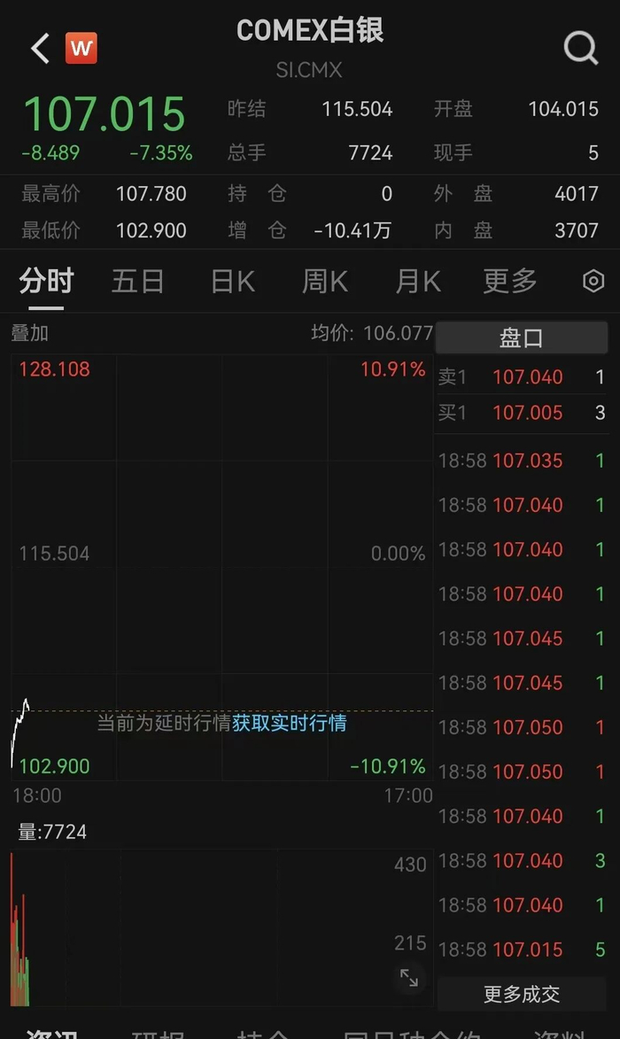 白银盘中一度涨超10%,但美股盘后抹平涨幅。截至发稿,COMEX白银期货报106.4美元/盎司,跌7.88%。