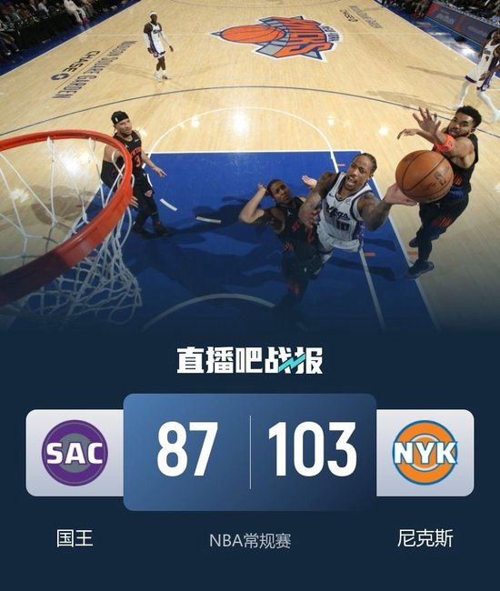 一开场,双方势均力敌,比分交替领先,布伦森连投带罚独得8分,尼克斯打出9-0的攻击波占据主动,德罗赞连得5分回应,但尼克斯持续发力将分差拉开到两位数,次节国王轮番冲击内线得手缩小分差,尼克斯突然哑火,国王一波9-0一度反超比分,半场战罢尼克斯52-51领先国王。下半场,唐斯连续造成威少犯规,双方继续缠斗,比分始终紧咬,末节尼克斯稳扎稳打逐渐占据场上主动,关键时刻尼克斯攻防发力打出10-0的攻击波确立优势,国王苦苦追赶无果。最终,尼克斯103-87击退国王,主场过关。