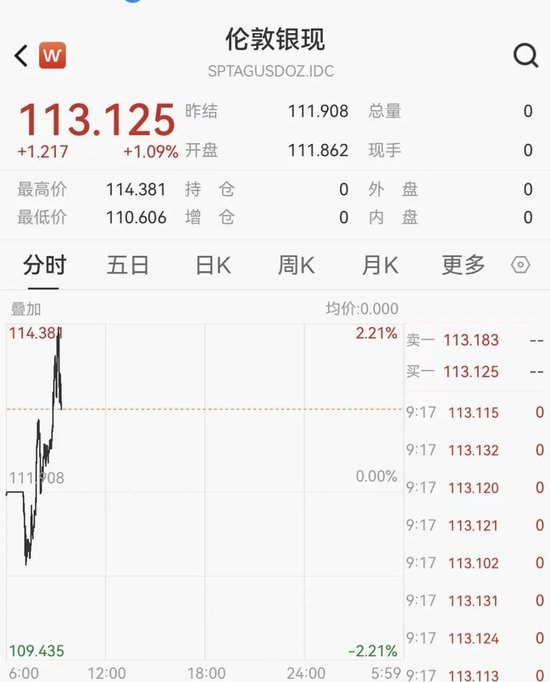 伦敦银现涨超1%突破113美元。