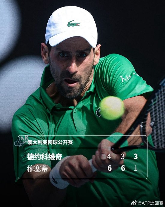 直播吧01月28日讯 澳网男单1/4决赛,38岁的德约科维奇在4-6、3-6、3-1时,因对手穆塞蒂因伤退赛,成功晋级男单四强!
