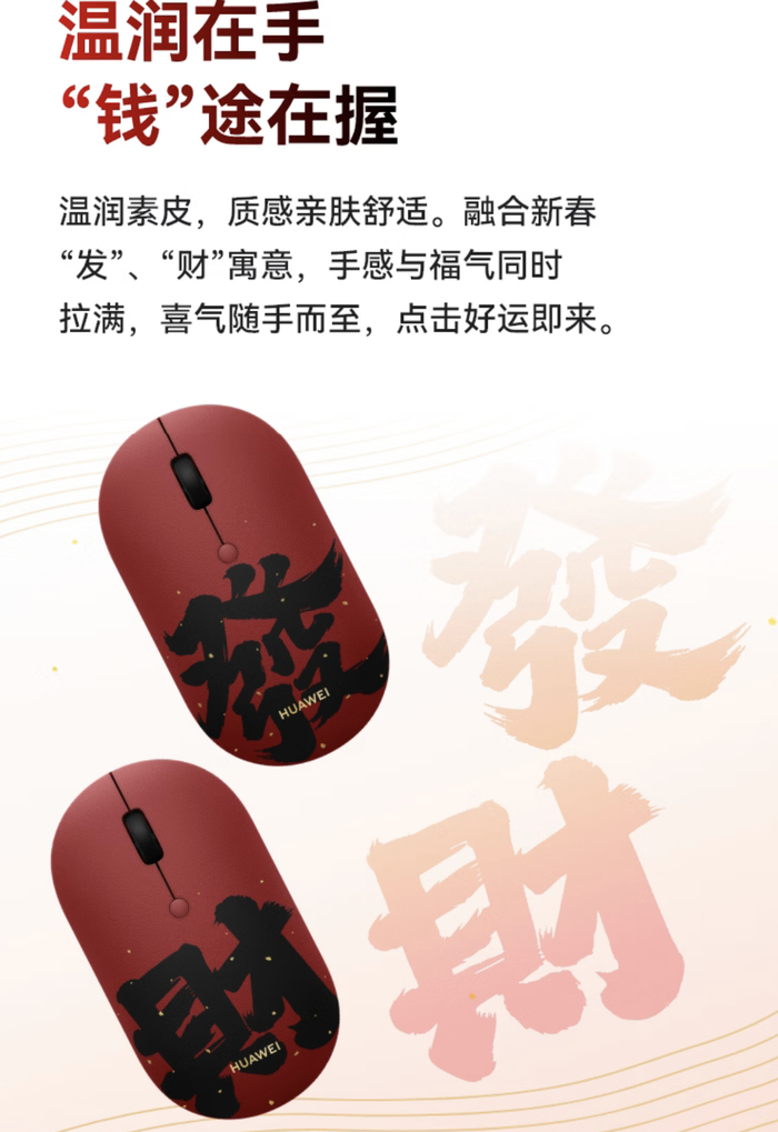 IT之家 1 月 28 日消息,华为宣布旗下无线鼠标 Slim 素皮版已于今天 10:08 在京东开售,该产品采用红色素皮外观,提供“发”“财”两字版本,定价均为 169 元。