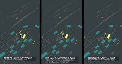 如对比视频所示,在左侧“原始算法+无AI主体”的组合下,自车表现犹豫,直至对向车辆完全通过后才开始通行,无法满足效率要求;在中间“新算法+无AI主体”的模拟中,自车仅按预设轨迹行驶,缺乏对周边车辆行为的预测,最后发生碰撞,无法满足安全要求;在最右侧“新算法+AI主体”的加持下,自车能够实时判断周边车辆的行驶意图,在确保安全的前提下流畅通过,实现了效率和安全双重保障。
