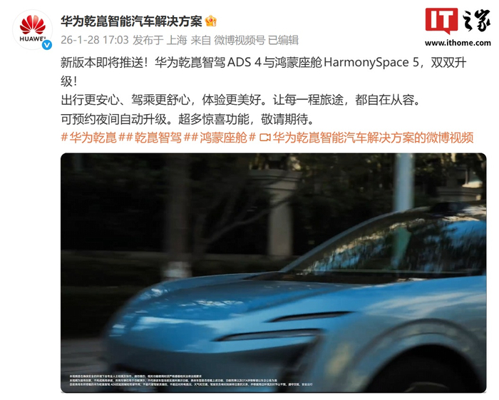 IT之家 1 月 28 日消息,华为乾崑智能汽车解决方案官方微博今日宣布,乾崑智驾 ADS 4鸿蒙座舱 HarmonySpace 5 的新版本即将推送,并通过视频介绍了新版本部分更新内容。