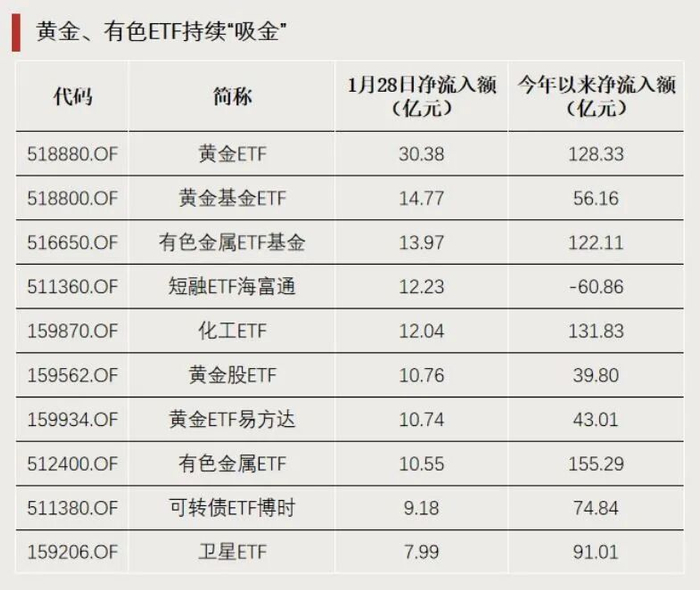 Wind数据显示,黄金ETF(518880)1月28日净流入30.38亿元,今年以来净流入128.33亿元;黄金基金ETF(518800)1月28日净流入14.77亿元,今年以来净流入56.16亿元;有色金属ETF基金(516650)1月28日净流入13.97亿元,今年以来净流入122.11亿元;化工ETF(159870)1月28日净流入12.04亿元,今年以来净流入131.83亿元。