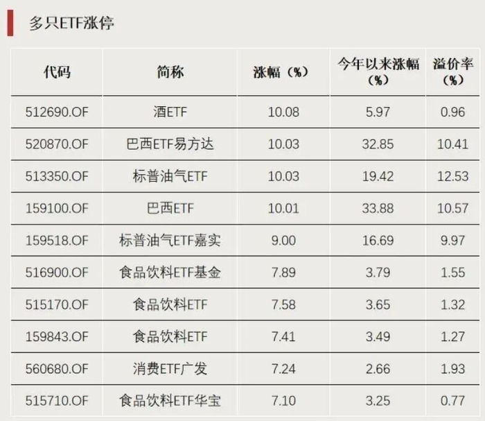 ETF方面,今日白酒板块大涨,酒ETF涨停,多只食品饮料ETF大涨。此外,2只巴西ETF近期因资源逻辑受到关注,今日集体涨停,溢价率较高。