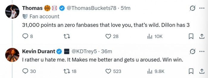 Thomas ?⚾️(此前竖中指嘲讽杜兰特的球迷):你有31000分,但没有任何球迷爱你,这真是疯狂。狄龙有3个。