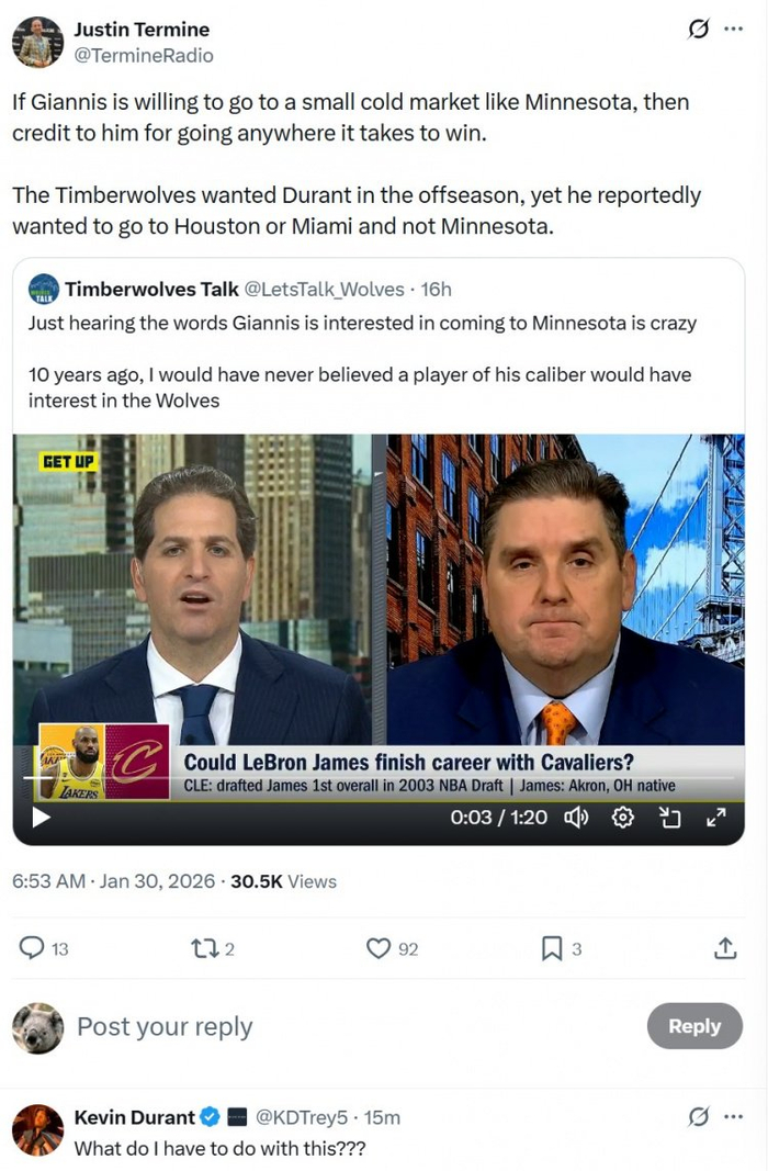 直播吧1月30日讯 今天,美记Justin Termine评论了有关字母哥的一则交易流言,他说道:“如果字母哥愿意去像明尼苏达这样寒冷的小市场打球,那说明他为了赢球愿意去任何地方。森林狼在去年休赛期曾想要杜兰特,但据报道,杜兰特更想去休斯敦或迈阿密,而不是明尼苏达。”