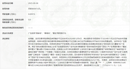 据信用中国显示,保利发展旗下陕西保利房地产开发有限公司负责的云谷和著项目存在多项虚假宣传及违规宣传行为,已于2025年9月8日,由西咸新区市场监督管理局处以80097.6元罚款。
